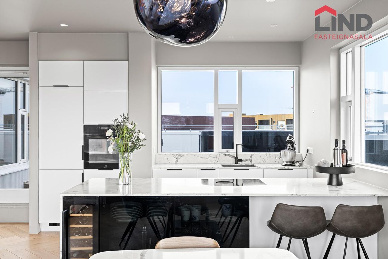 Eldhús: Með fiskibeinaparketi á gólfi og eldhúsinnréttingu með eyju frá GKS. Lýsing undir efri skápum. Allur steinn í eldhúsi er sérsmíðaður hjá Steinprýði steinsmiðju. Innbyggður kæliskápur með frysti, innbyggð uppþvottavél, bakaraofn og spansuðuhelluborð með innb. gufugleypi. Sérsmíðaðir skápar með dökku gleri og vínkælir eru undir eldhúseyju sem snúa að stofu.