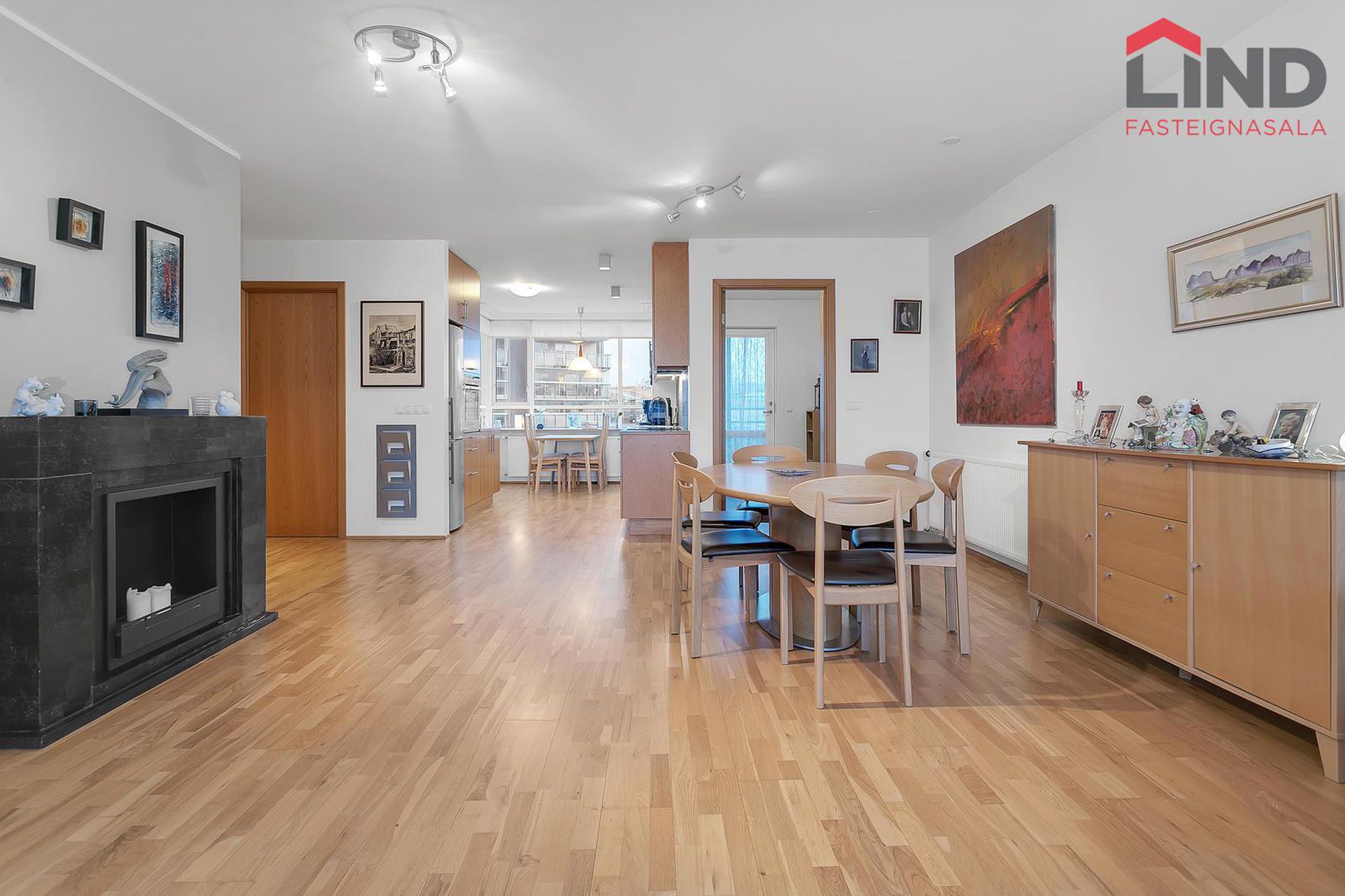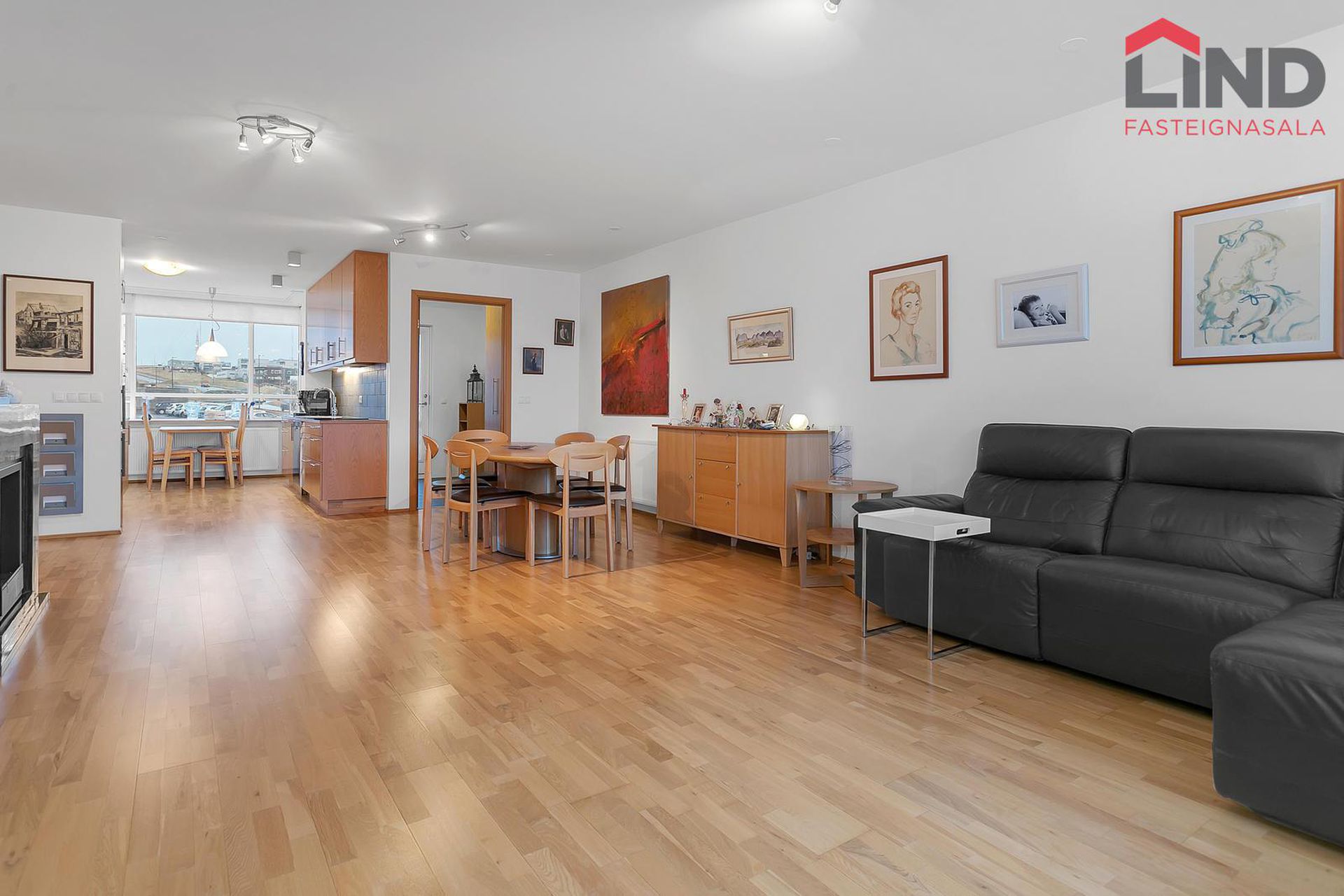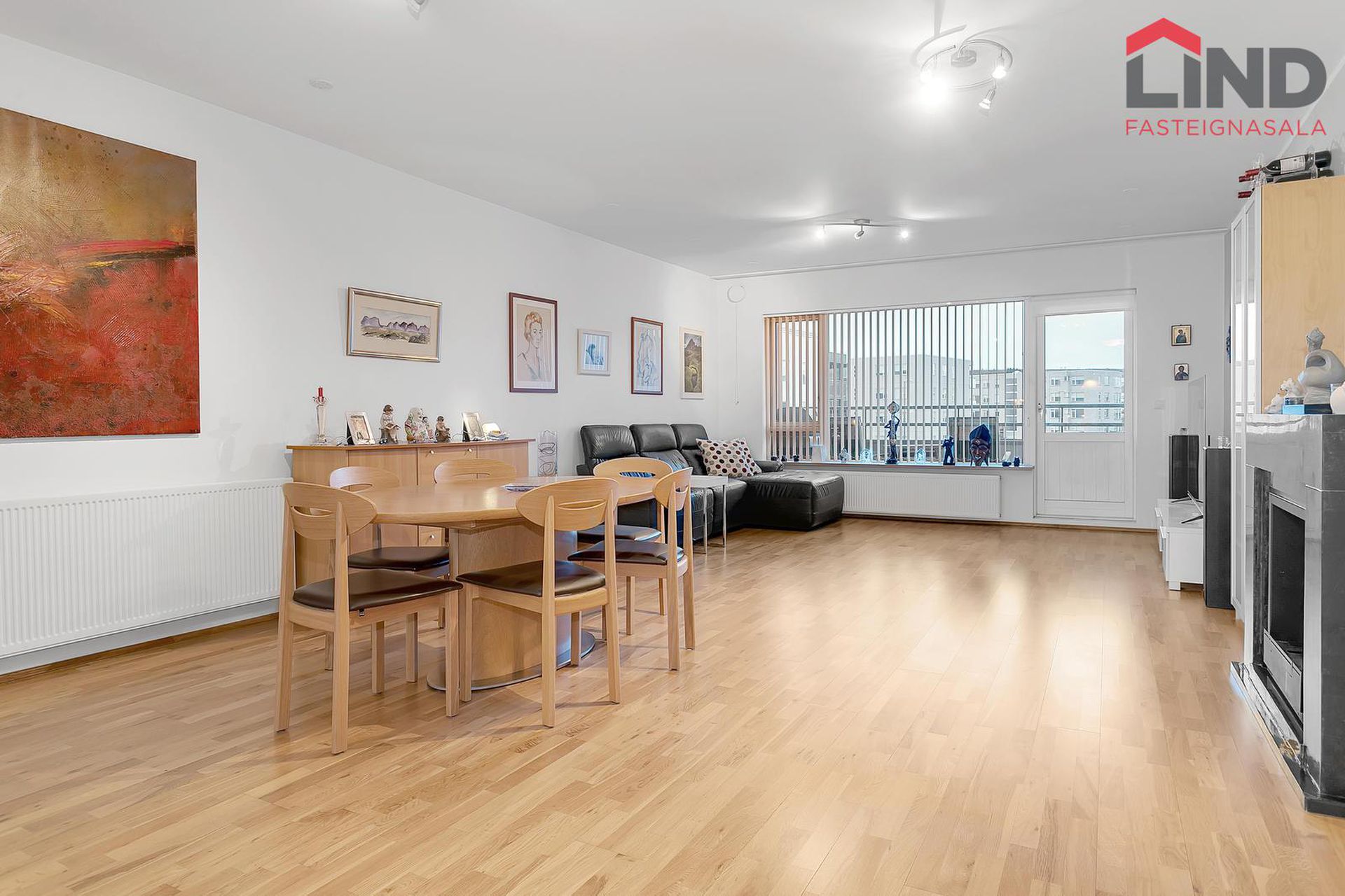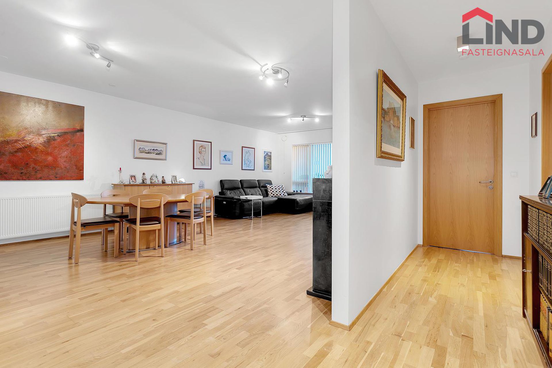 Stofa og borðstofa. Bjartar og rúmgóðar. Parketið var slípað upp og lakkað 2023. Útgengt á rúmgóðar svalir.