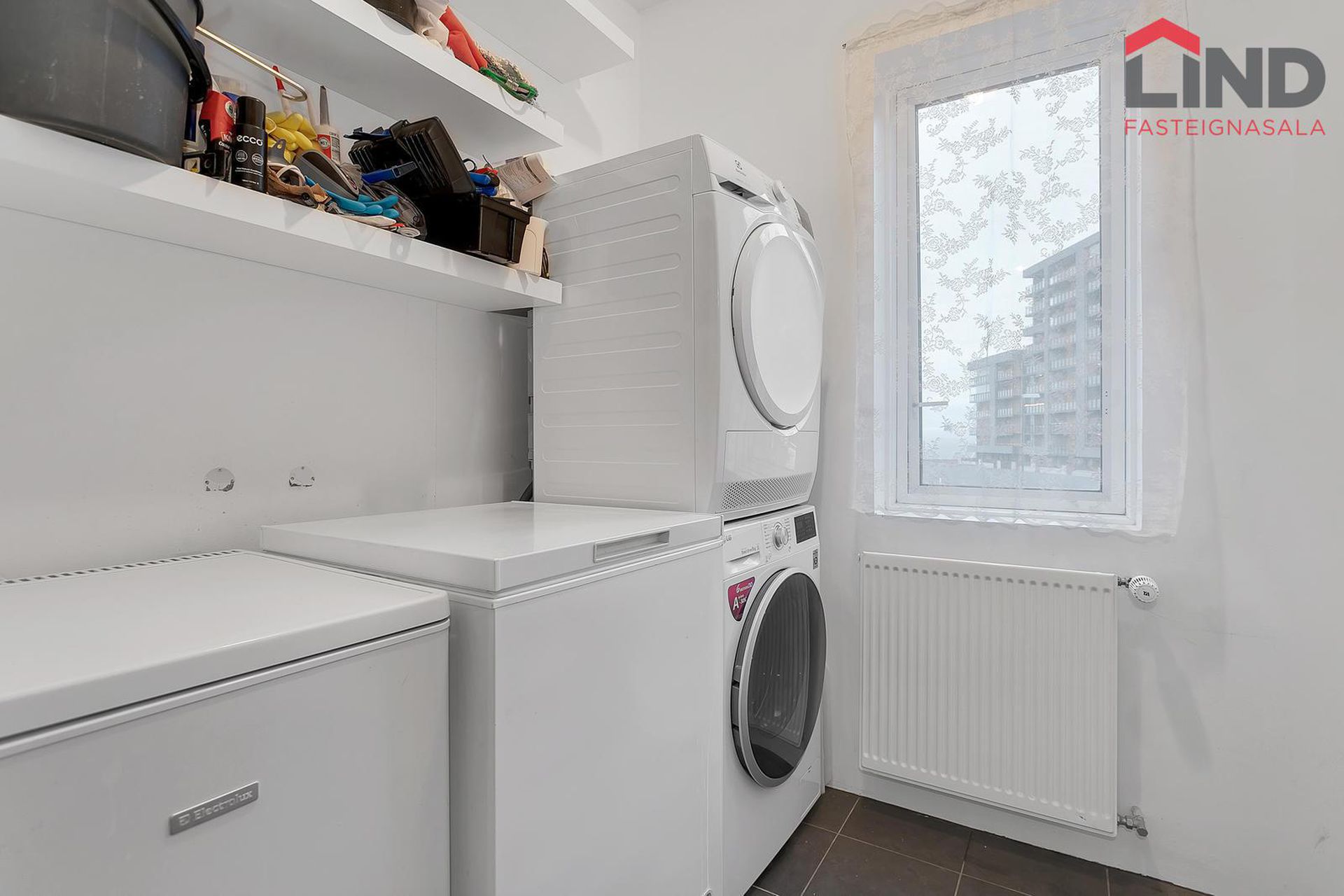 Þvottahús. Flísar á gólfi. Tengi fyrir skolvask. Hillur á veggjum. Þvottahúsið er með gluggum.