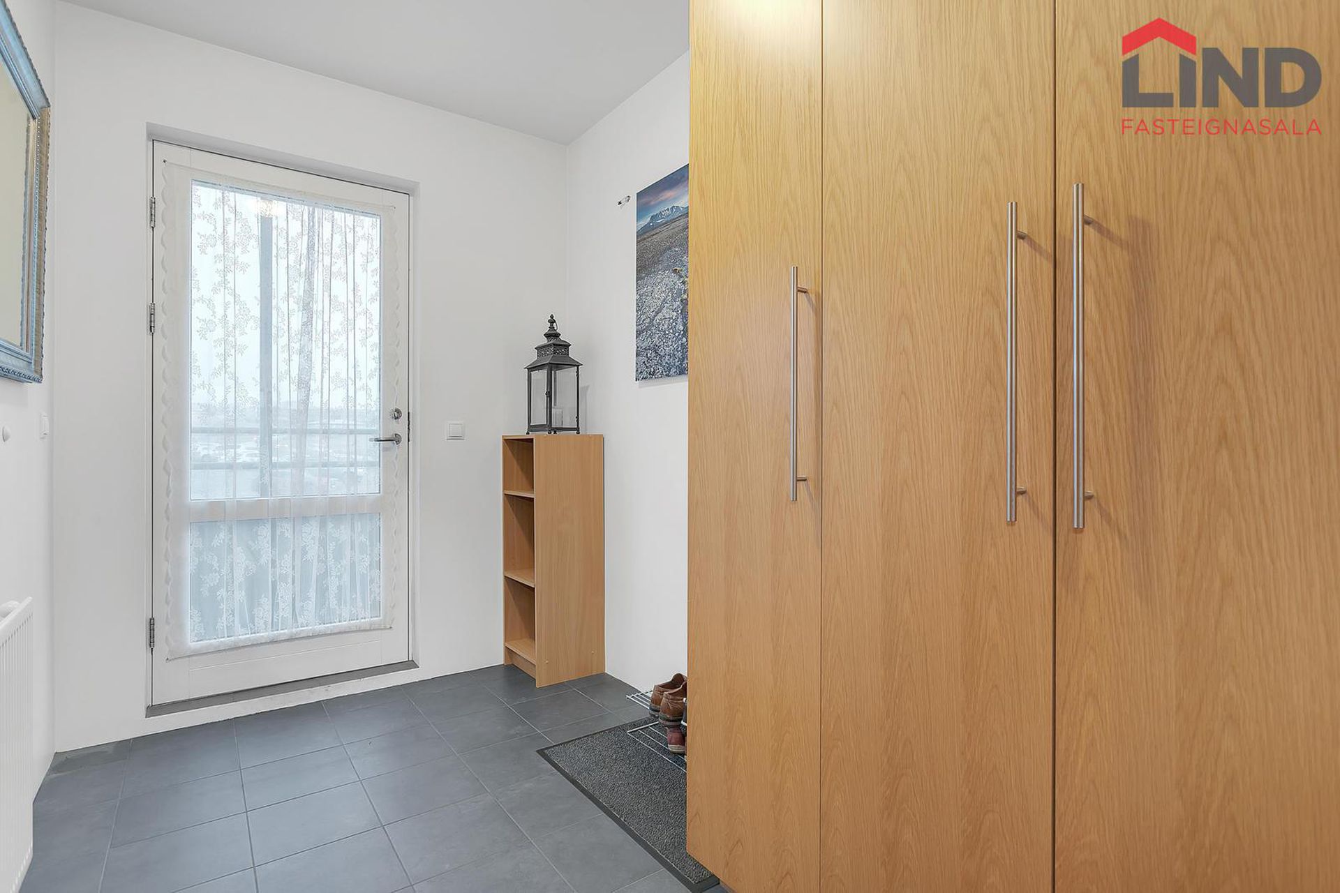 Forstofa. Rúmgóð forstofa með skápum og flísum á gólfi.