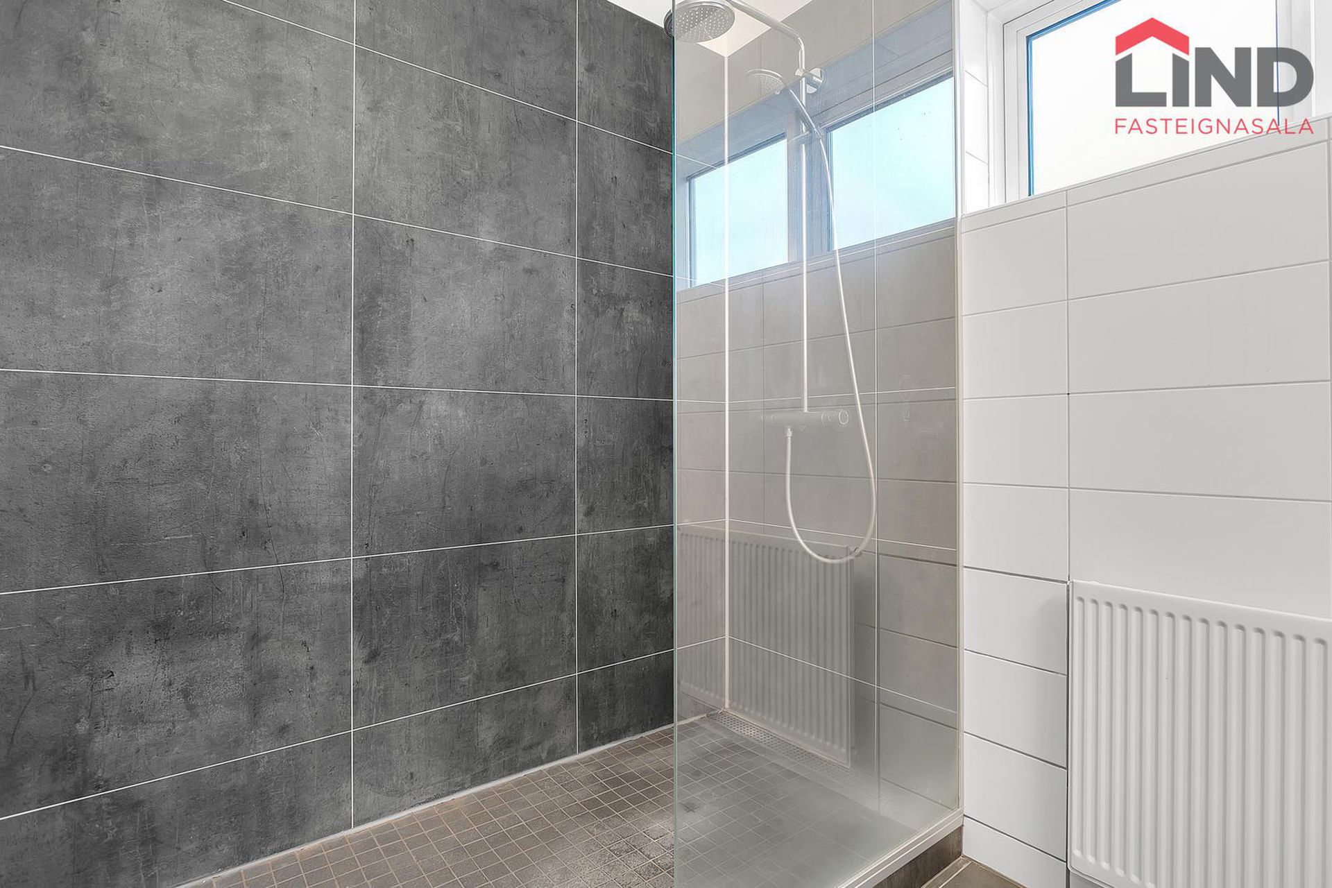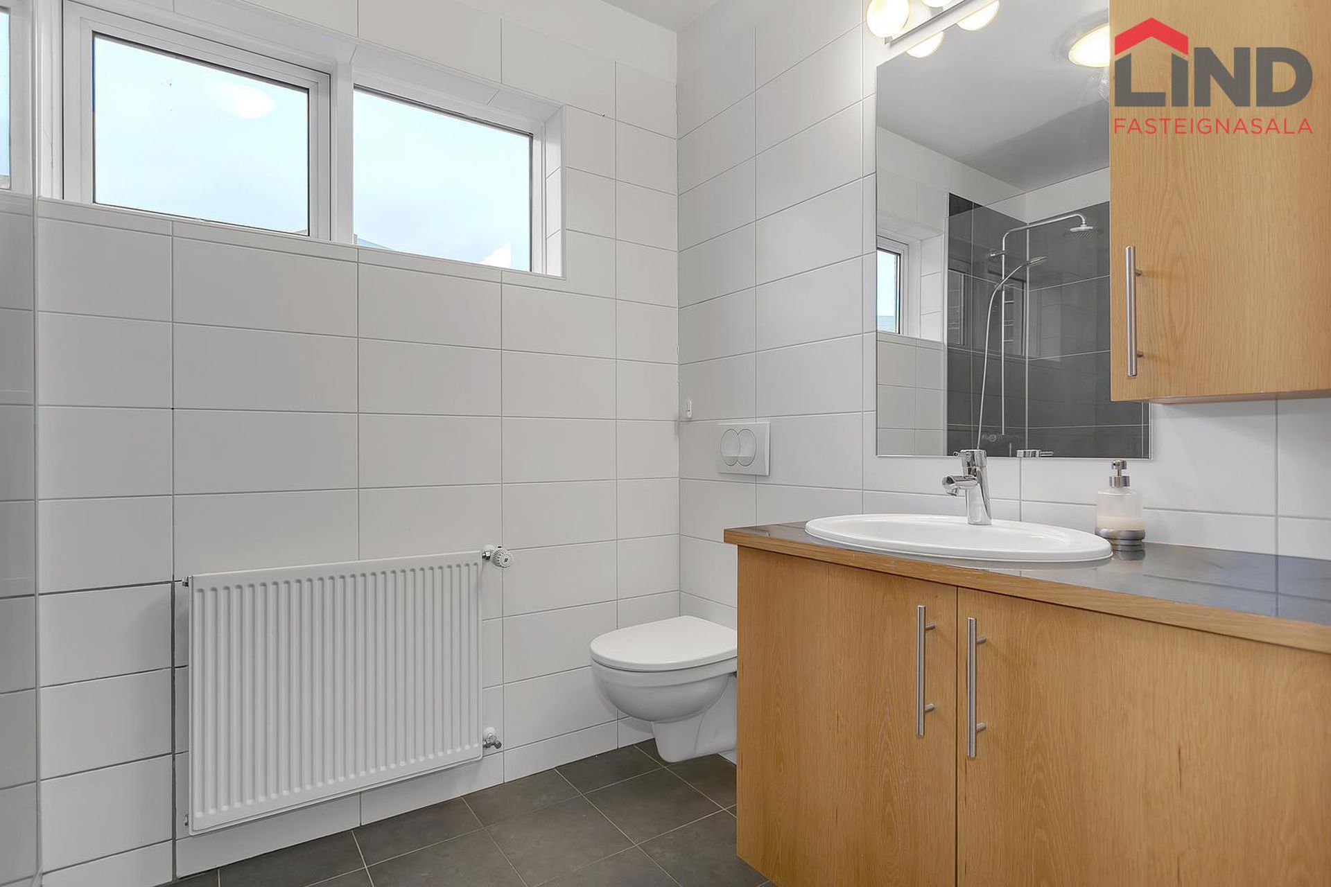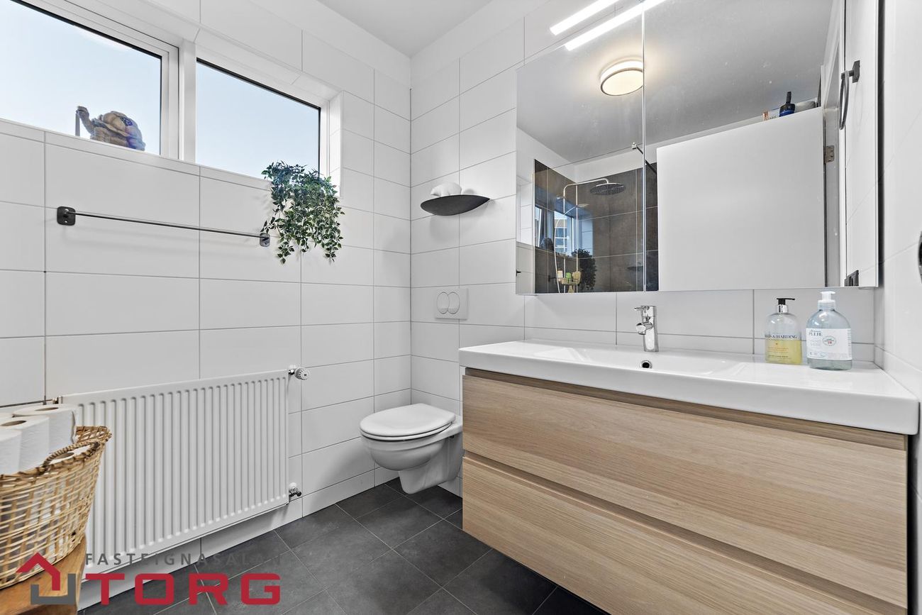 Baðherbergi. Flísalagt baðherbergi. Speglaskápur og innrétting frá 2024. Upphengt salerni, walk in sturta. Gluggar.