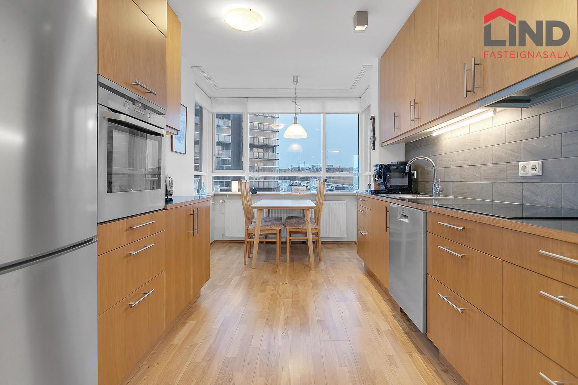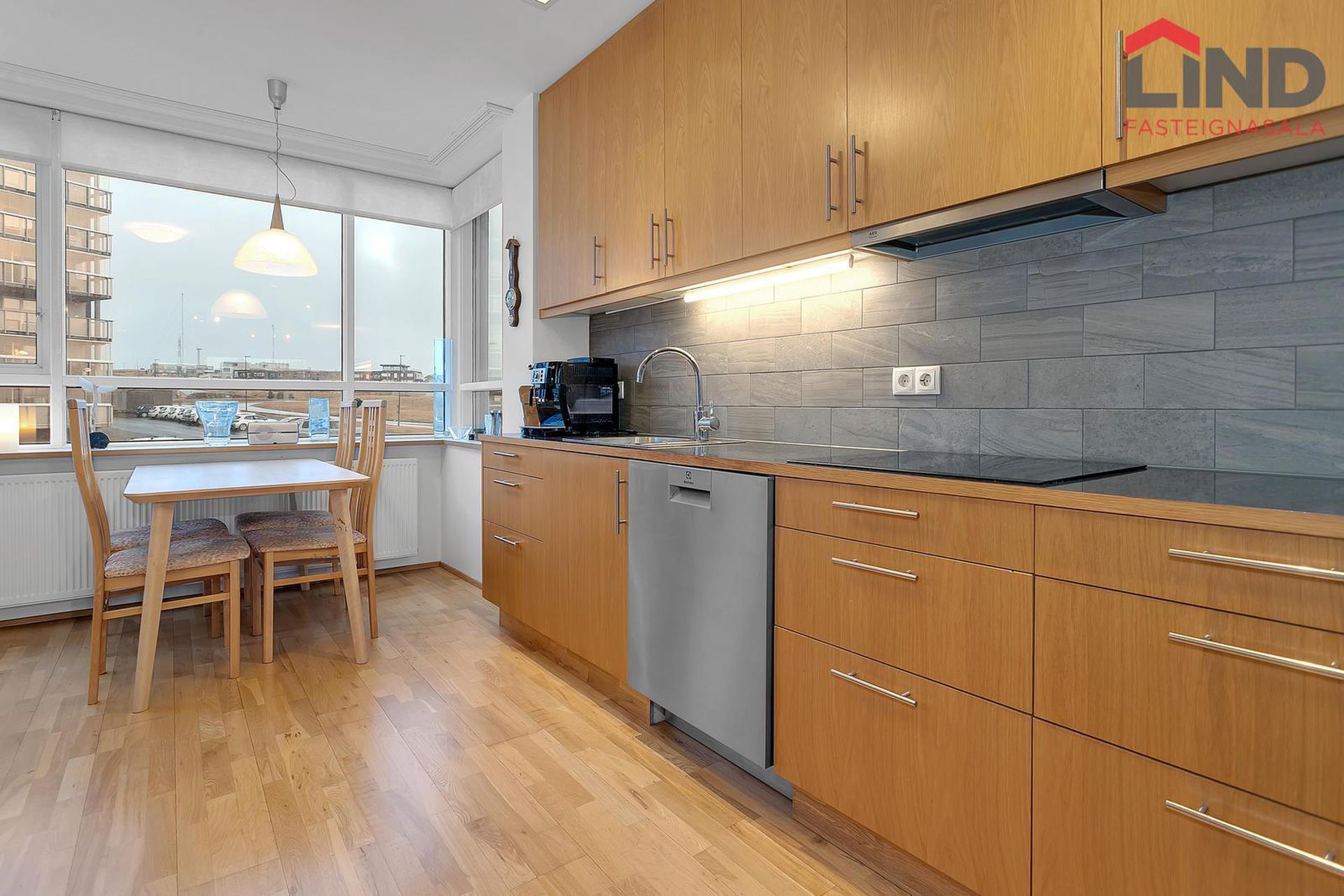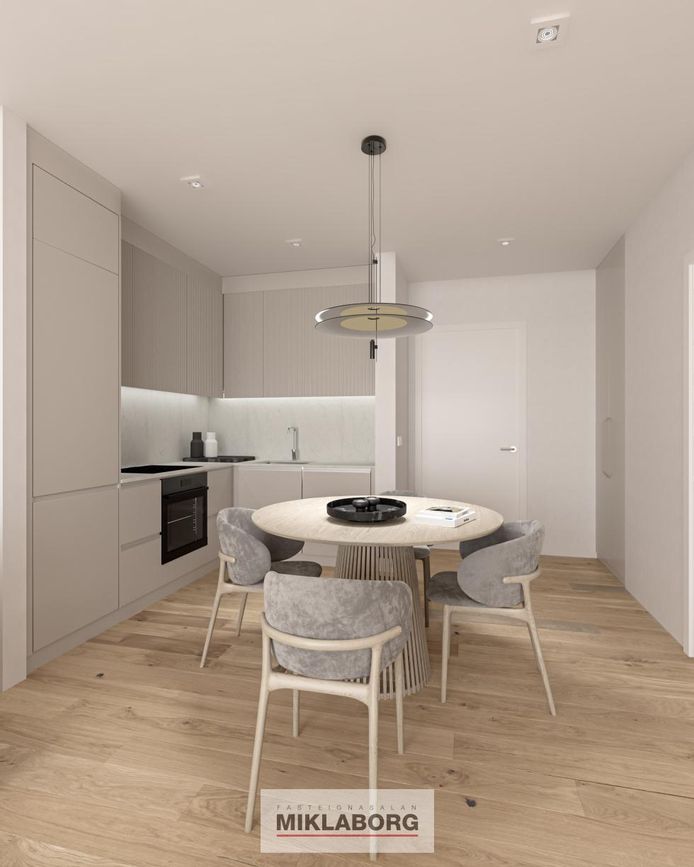 Eldhús. Bjart og rúmgott eldhús. Nýjar og fallegar 60x60 flísar. Borðplötum var skipt út árið 2022. Helluborð, loftgleypir, bakaraofn, tengi fyrir uppþvottavél. Góð eldhúsinnrétting, frá Axis, með góðu skápaplássi. Vaskurinn er fræsaður inn í innréttinguna. Eldhúsveggir eru fallega klæddir með viðarflísum.